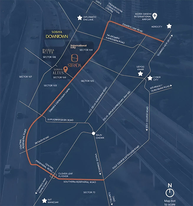 Sobha Strada Gurgaon enjoys excellent connectivity, with IGI Airport roughly 20–25 minutes away via Sobha Dwarka Expressway. Its location in Sector 106 makes travel convenient for frequent flyers and working professionals.